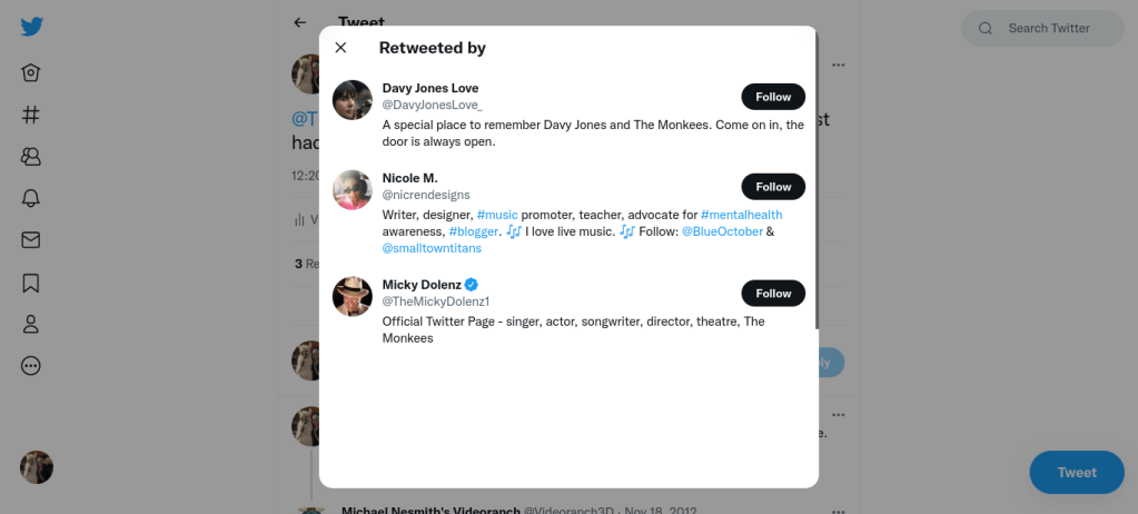 Mickey Dolenz from the Monkees once Retweeted a blog of mine. That was a personal highlight.